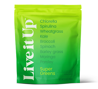 My go-to greens powder is Live it Up Super Greens. The formula contains natural, organic ingredients, such as leafy greens, cruciferous vegetables, and cereal grasses, as well as vitamins and minerals derived from whole foods. It’s naturally sweetened with monk fruit extract and comes in two delicious, refreshing flavors.